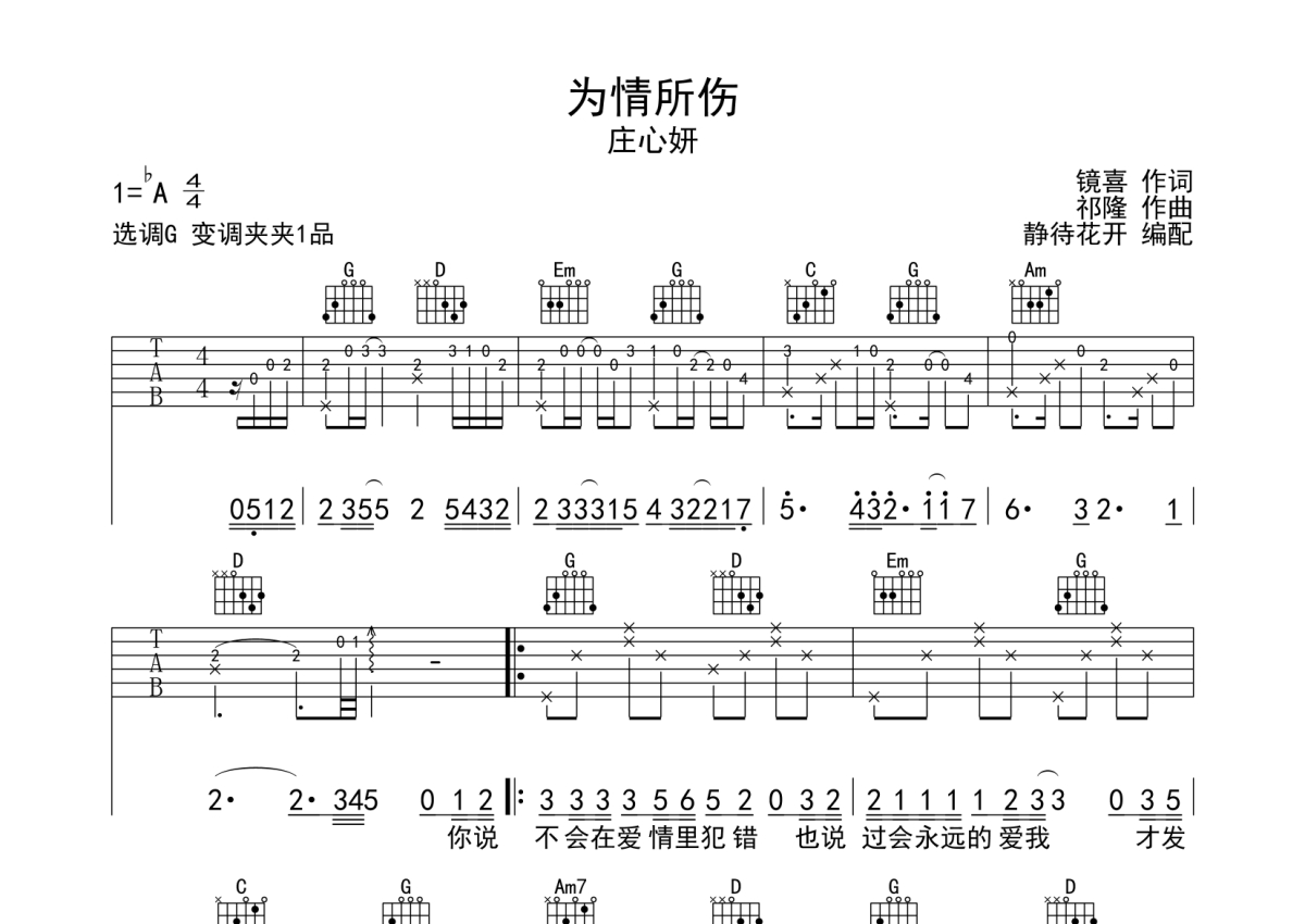 《为情所伤》是庄心妍演唱的一首歌曲,本吉他谱采用的是G调指法编配,这份吉他谱共有三张高清图谱,图谱由 @静待花开 编配上传,图谱使用六线谱编配,包含吉他和弦指法、简谱以及歌词部分,使用这份为情所伤吉他谱,可以让你更加方便地掌握这首歌曲的弹唱技巧,快来尝试吧。来自@静待花开编配吉他谱,采用G调和弦指法演奏,推荐变调夹夹第1品,原调bA调,也可以根据个人嗓音灵活选择变调夹位置,演奏速度大约每分钟85拍,演奏难度简单。