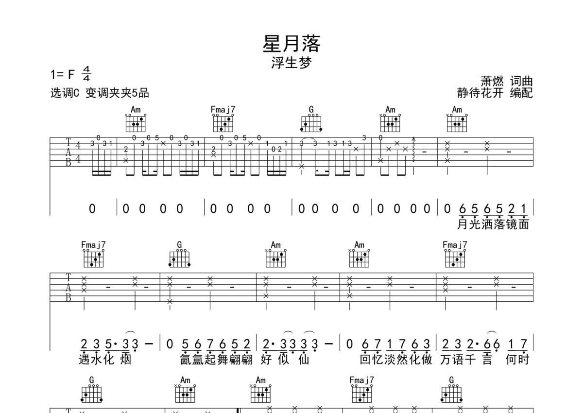 浮生梦《星月落》吉他谱 - C调弹唱六线谱