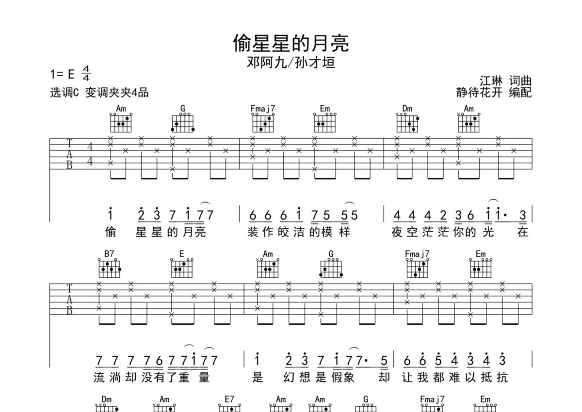 《偷星星的月亮》是邓阿九/孙才垣演唱的一首歌曲,本吉他谱采用的是C调指法编配,这份吉他谱共有三张高清图谱,图谱由 @静待花开 编配上传,图谱使用六线谱编配,包含吉他和弦指法、简谱以及歌词部分,使用这份偷星星的月亮吉他谱,可以让你更加方便地掌握这首歌曲的弹唱技巧,快来尝试吧。来自@静待花开编配吉他谱,采用C调和弦指法演奏,推荐变调夹夹第4品,原调E调,也可以根据个人嗓音灵活选择变调夹位置,演奏速度大约每分钟85拍,演奏难度简单。