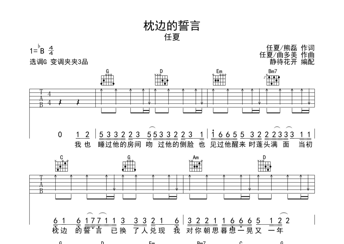 任夏《枕边的誓言》吉他谱 - G调弹唱六线谱