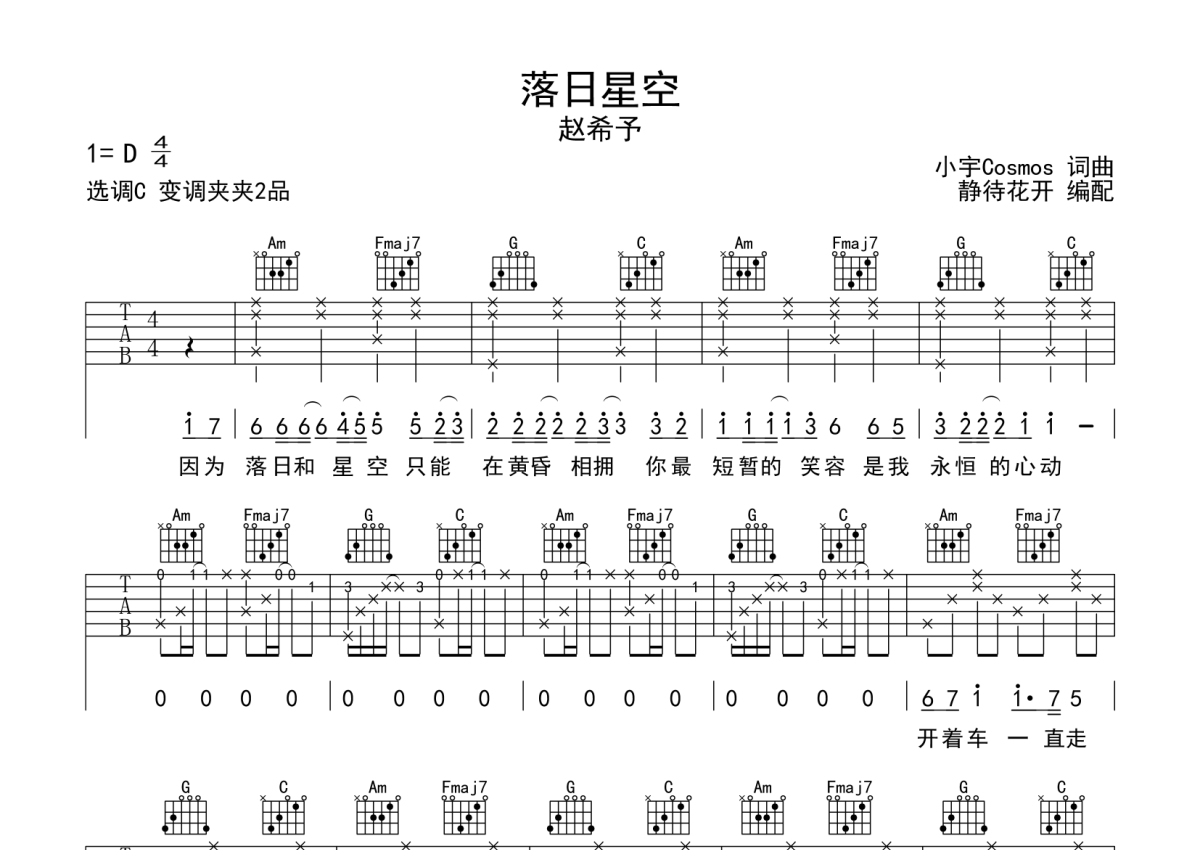 《落日星空》是赵希予演唱的一首歌曲,本吉他谱采用的是C调指法编配,这份吉他谱共有三张高清图谱,图谱由 @静待花开 编配上传,图谱使用六线谱编配,包含吉他和弦指法、简谱以及歌词部分,使用这份落日星空吉他谱,可以让你更加方便地掌握这首歌曲的弹唱技巧,快来尝试吧。来自@静待花开编配吉他谱,采用C调和弦指法演奏,推荐变调夹夹第2品,原调D调,也可以根据个人嗓音灵活选择变调夹位置,演奏速度大约每分钟95拍,演奏难度简单。