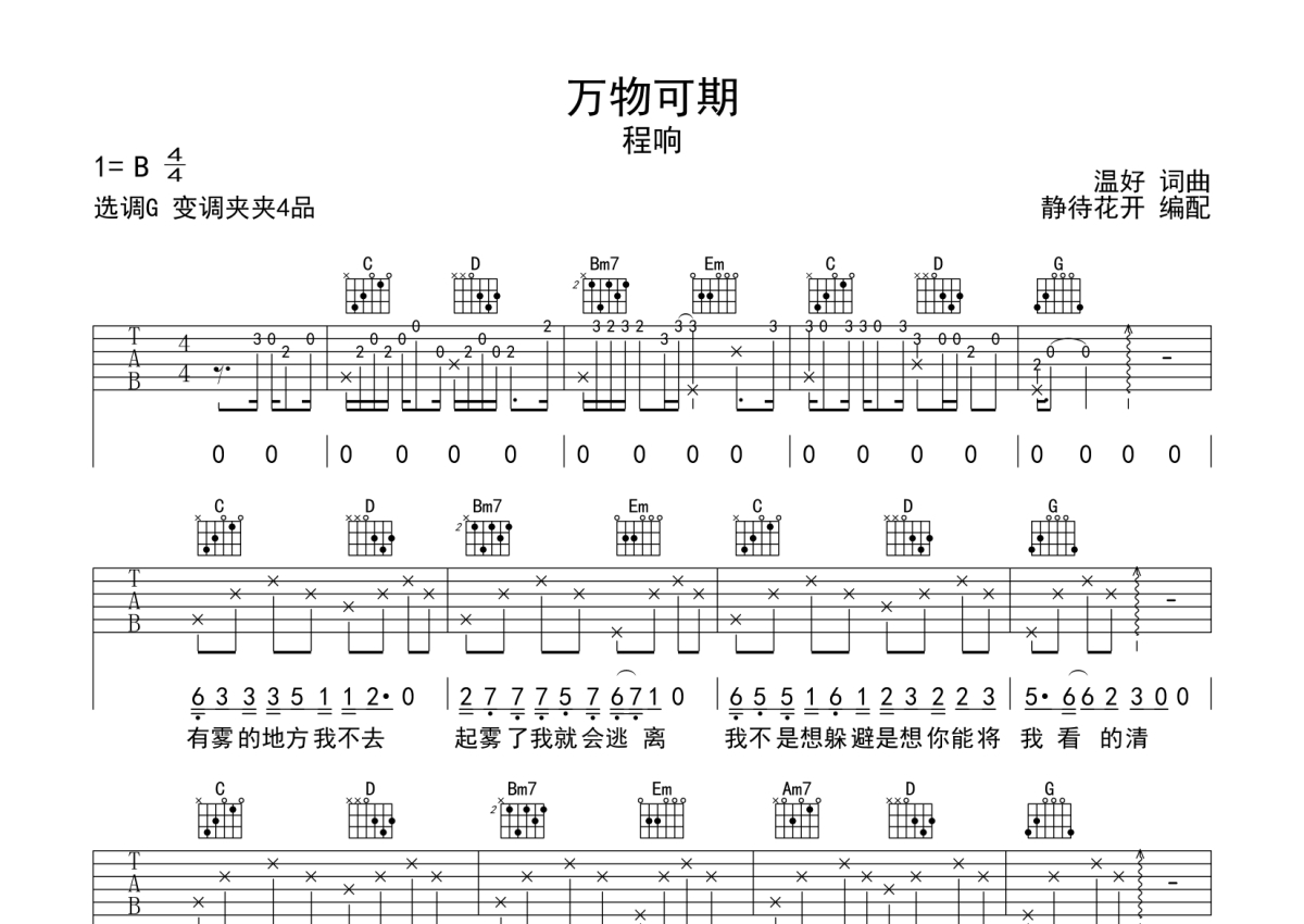 程响《万物可期》吉他谱 - G调弹唱六线谱