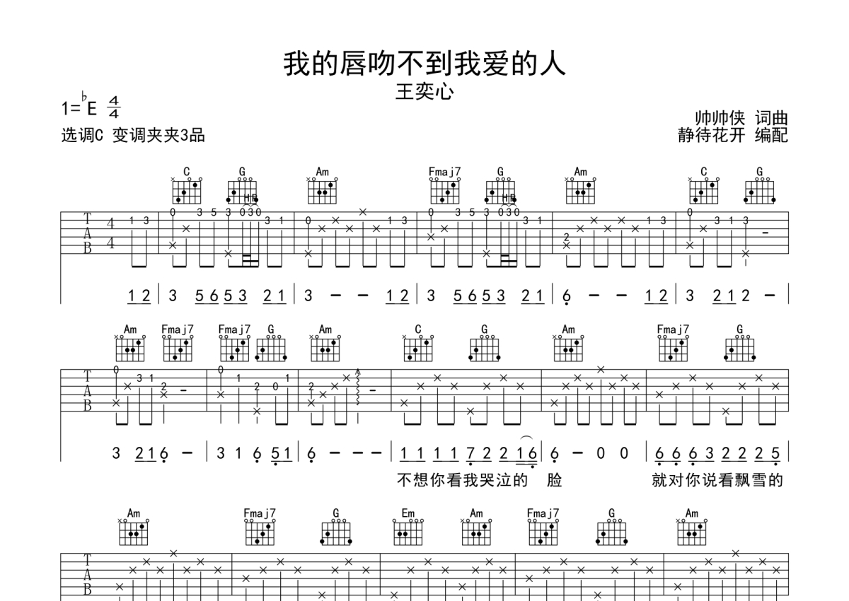 《我的唇吻不到我爱的人》是王奕心演唱的一首歌曲,本吉他谱采用的是C调指法编配,这份吉他谱共有两张高清图谱,图谱由 @静待花开 编配上传,图谱使用六线谱编配,包含吉他和弦指法、简谱以及歌词部分,使用这份我的唇吻不到我爱的人吉他谱,可以让你更加方便地掌握这首歌曲的弹唱技巧,快来尝试吧。我的唇吻不到我爱的人吉他六线谱,来自@静待花开编配制作,C调和弦指法演奏版,原调bE调,推荐变调夹夹3品,大家也可以根据实际情况选择变调夹,适合自己音高即可,速度大概每分钟80拍,整体难度简单。