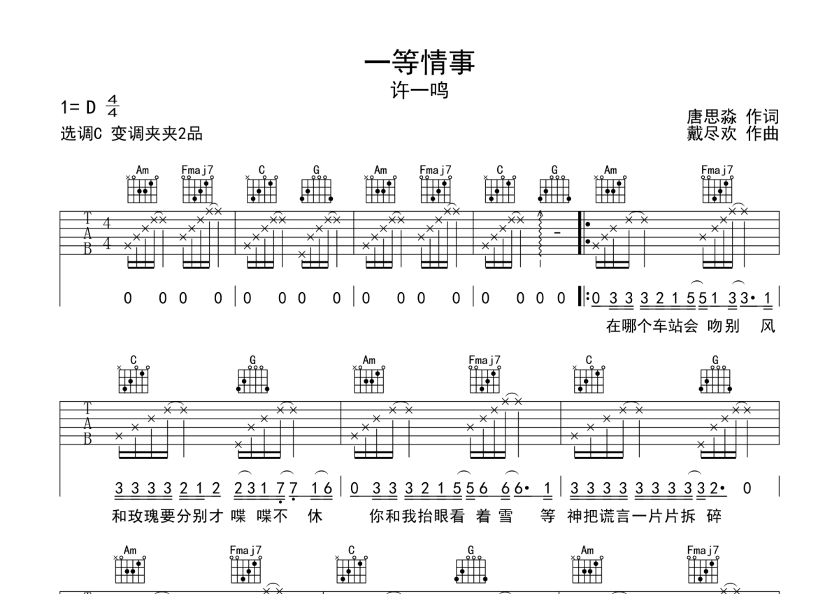 《一等情事》是许一鸣演唱的一首歌曲,本吉他谱采用的是C调指法编配,这份吉他谱共有两张高清图谱,图谱由 @静待花开 编配上传,图谱使用六线谱编配,包含吉他和弦指法、简谱以及歌词部分,使用这份一等情事吉他谱,可以让你更加方便地掌握这首歌曲的弹唱技巧,快来尝试吧。一等情事吉他弹唱谱,来自@静待花开编配制谱,本吉他谱采用C调和弦编配,演奏建议变调夹夹第2品,原调D调,琴友们也可以根据自己嗓音条件选择变调夹,演奏速度大概85拍每分钟,难度简单。