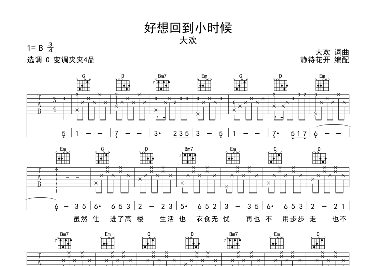 大欢《好想回到小时候》吉他谱 - G调弹唱六线谱