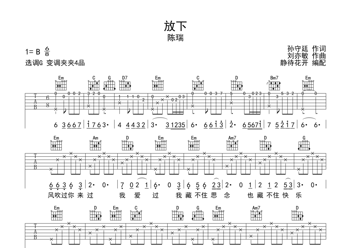 《放下》是陈瑞演唱的一首歌曲,本吉他谱采用的是G调指法编配,这份吉他谱共有两张高清图谱,图谱由 @静待花开 编配上传,图谱使用六线谱编配,包含吉他和弦指法、简谱以及歌词部分,使用这份放下吉他谱,可以让你更加方便地掌握这首歌曲的弹唱技巧,快来尝试吧。放下吉他弹唱谱,来自@静待花开编配制谱,本吉他谱采用G调和弦编配,演奏建议变调夹夹第4品,原调B调,琴友们也可以根据自己嗓音条件选择变调夹,演奏速度大概75拍每分钟,难度简单。