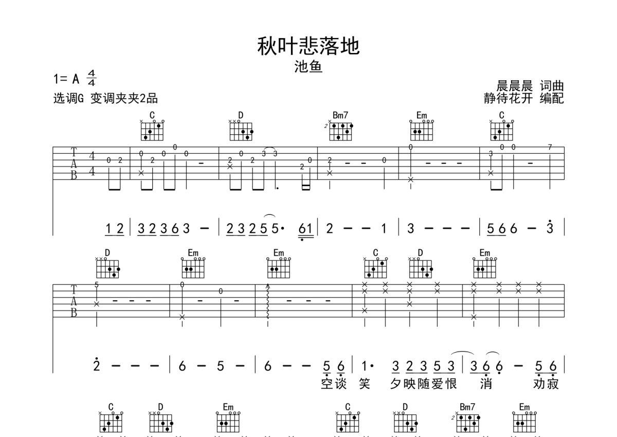 池鱼《秋叶悲落地》吉他谱 - G调弹唱六线谱