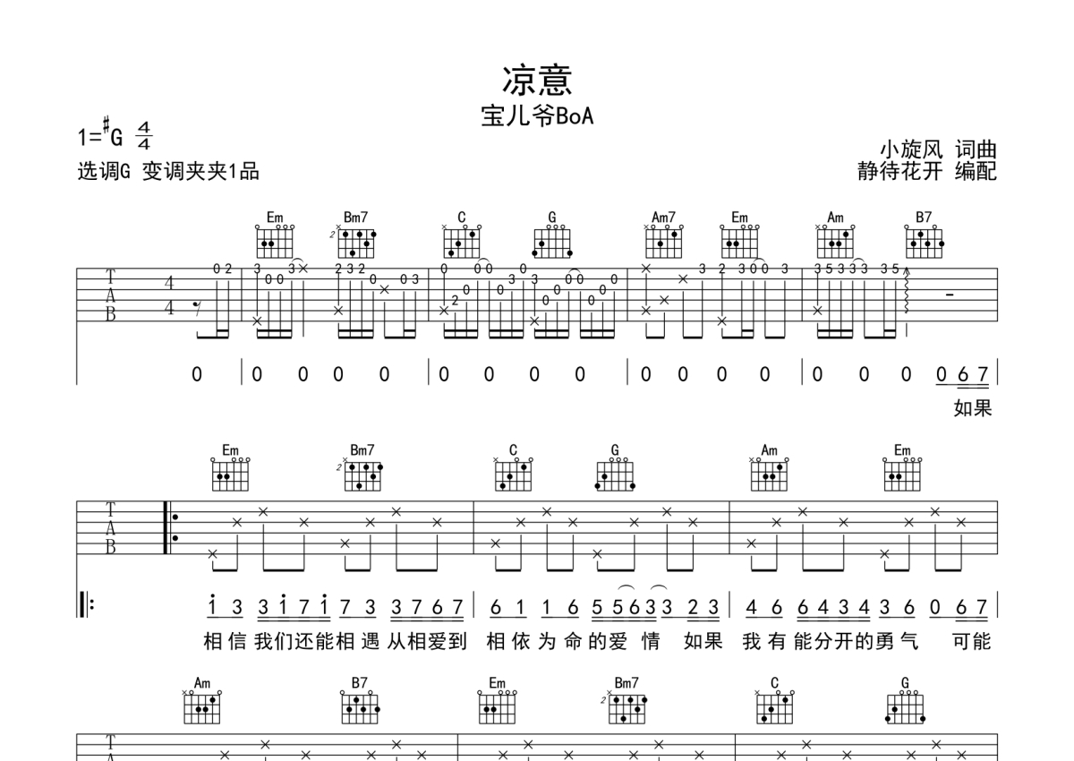 《凉意》是宝儿爷BoA演唱的一首歌曲,本吉他谱采用的是G调指法编配,这份吉他谱共有两张高清图谱,图谱由 @静待花开 编配上传,图谱使用六线谱编配,包含吉他和弦指法、简谱以及歌词部分,使用这份凉意吉他谱,可以让你更加方便地掌握这首歌曲的弹唱技巧,快来尝试吧。凉意吉他六线谱,来自@静待花开编配制作,G调和弦指法演奏版,原调#G调,推荐变调夹夹1品,大家也可以根据实际情况选择变调夹,适合自己音高即可,速度大概每分钟85拍,整体难度简单。