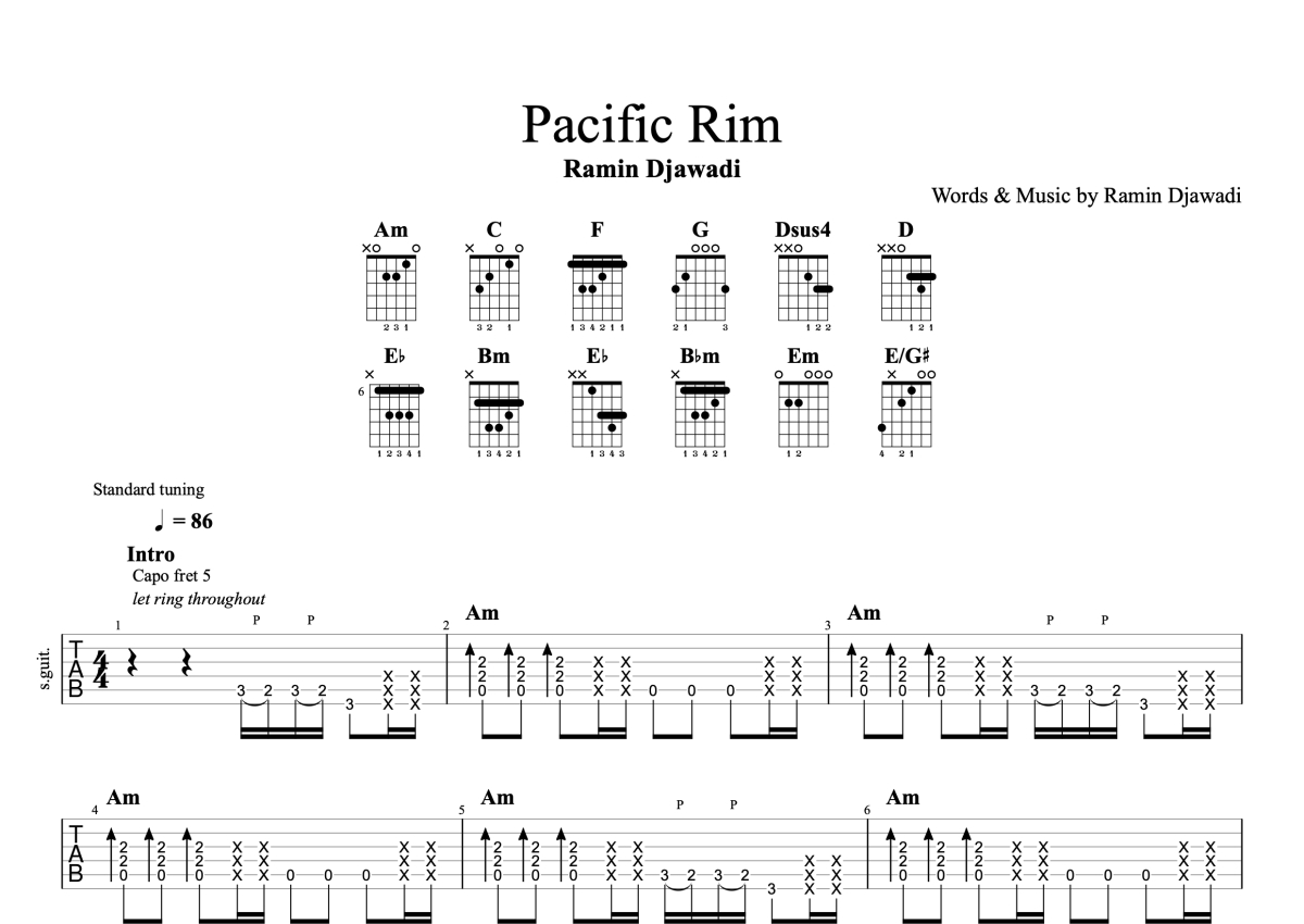《《Pacific Rim》环太平洋BGM》是Ramin Djawadi演唱的一首歌曲,完整编配版,本吉他谱采用的是C调指法编配,这份吉他谱共有五张高清图谱,图谱由 @一颗加菲 编配上传,图谱使用六线谱编配,曲谱配备了相关的音频提供试听,使用这份《Pacific Rim》环太平洋BGM吉他谱,可以让你更加方便地掌握这首歌曲的演奏技巧,快来尝试吧。