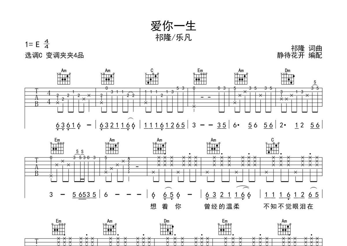 祁隆/乐凡《爱你一生》吉他谱 - C调弹唱六线谱