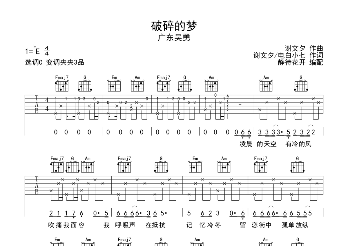《破碎的梦》是广东吴勇演唱的一首歌曲,本吉他谱采用的是C调指法编配,这份吉他谱共有两张高清图谱,图谱由 @静待花开 编配上传,图谱使用六线谱编配,包含吉他和弦指法、简谱以及歌词部分,使用这份破碎的梦吉他谱,可以让你更加方便地掌握这首歌曲的弹唱技巧,快来尝试吧。破碎的梦吉他六线谱,来自@静待花开编配制作,C调和弦指法演奏版,原调Eb调,推荐变调夹夹3品,大家也可以根据实际情况选择变调夹,适合自己音高即可,速度大概每分钟85拍,整体难度简单。