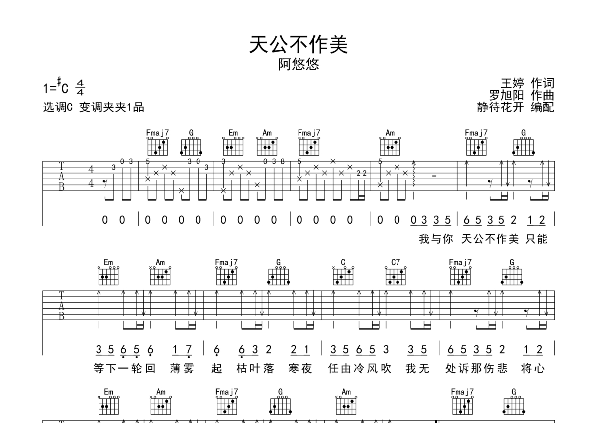 阿悠悠《天公不作美》吉他谱 - C调弹唱六线谱
