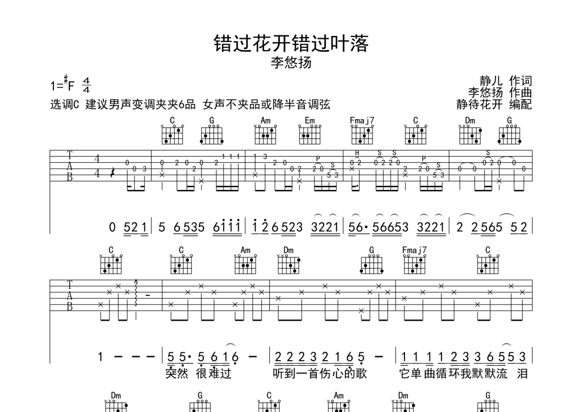 《错过花开错过叶落》是李悠扬演唱的一首歌曲,本吉他谱采用的是C调指法编配,这份吉他谱共有两张高清图谱,图谱由 @静待花开 编配上传,图谱使用六线谱编配,包含吉他和弦指法、简谱以及歌词部分,使用这份错过花开错过叶落吉他谱,可以让你更加方便地掌握这首歌曲的弹唱技巧,快来尝试吧。错过花开错过叶落吉他弹唱谱,来自@静待花开编配制谱,本吉他谱采用C调和弦编配,演奏建议男声夹6品,女声不夹品或降半音调弦,原调#F调,琴友们也可以根据自己嗓音条件选择变调夹,演奏速度大概80拍每分钟,难度简单。
