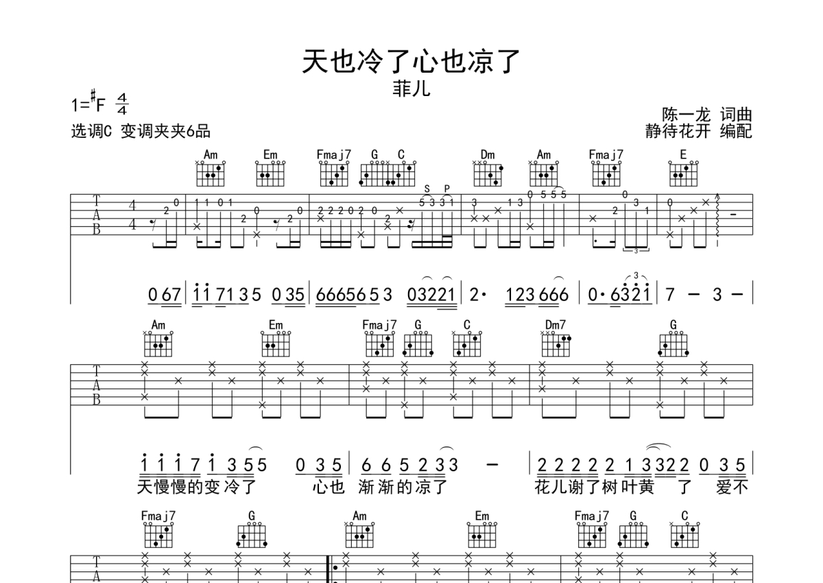 《天也冷了心也凉了》是菲儿演唱的一首歌曲,本吉他谱采用的是C调指法编配,这份吉他谱共有两张高清图谱,图谱由 @静待花开 编配上传,图谱使用六线谱编配,包含吉他和弦指法、简谱以及歌词部分,使用这份天也冷了心也凉了吉他谱,可以让你更加方便地掌握这首歌曲的弹唱技巧,快来尝试吧。天也冷了心也凉了吉他弹唱谱,来自@静待花开编配制谱,本吉他谱采用C调和弦编配,演奏建议变调夹夹第6品,原调#F调,琴友们也可以根据自己嗓音条件选择变调夹,演奏速度大概80拍每分钟,难度简单。