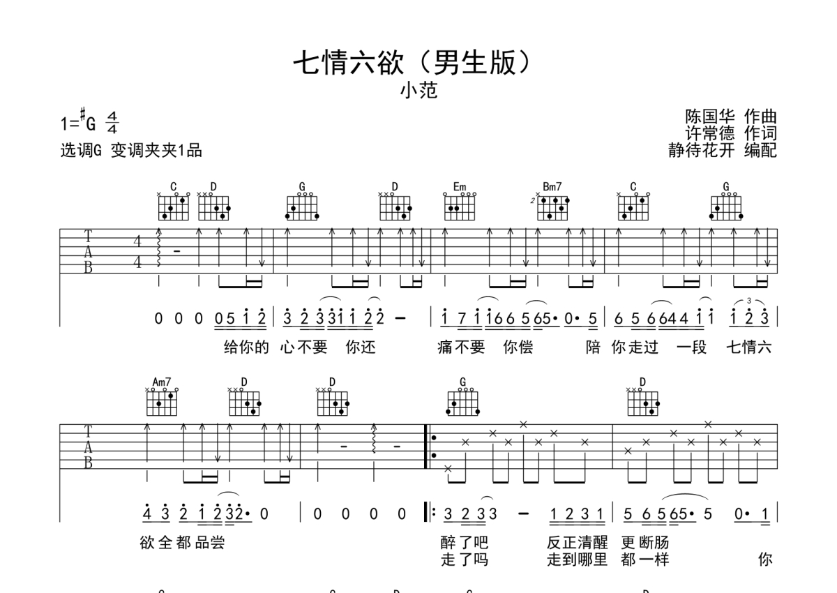 小范《七情六欲》吉他谱 - G调弹唱六线谱