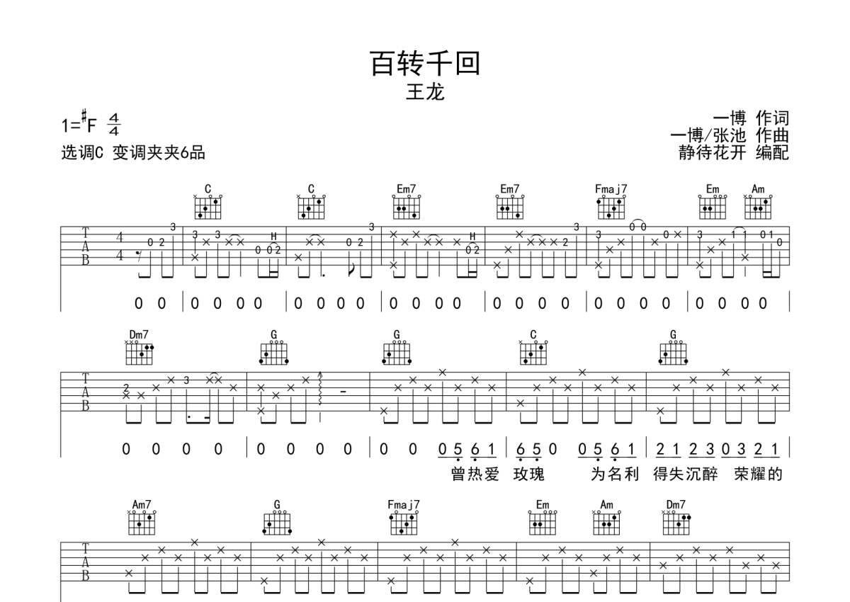 王龙《百转千回》吉他谱 - C调弹唱六线谱