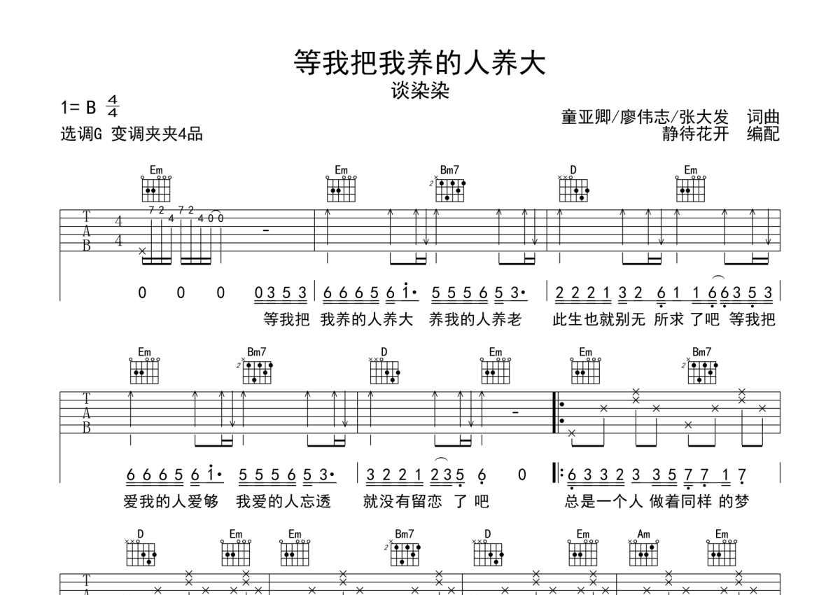 《等我把我养的人养大》是谈染染演唱的一首歌曲,本吉他谱采用的是G调指法编配,这份吉他谱共有两张高清图谱,图谱由 @静待花开 编配上传,图谱使用六线谱编配,包含吉他和弦指法、简谱以及歌词部分,使用这份等我把我养的人养大吉他谱,可以让你更加方便地掌握这首歌曲的弹唱技巧,快来尝试吧。等我把我养的人养大吉他谱,来自@静待花开编配扒谱,采用G调和弦指法演奏,推荐变调夹夹第4品,原调为B调,也可以根据个人嗓音灵活选择变调夹位置,演奏速度大约每分钟85拍,演奏难度为简单。