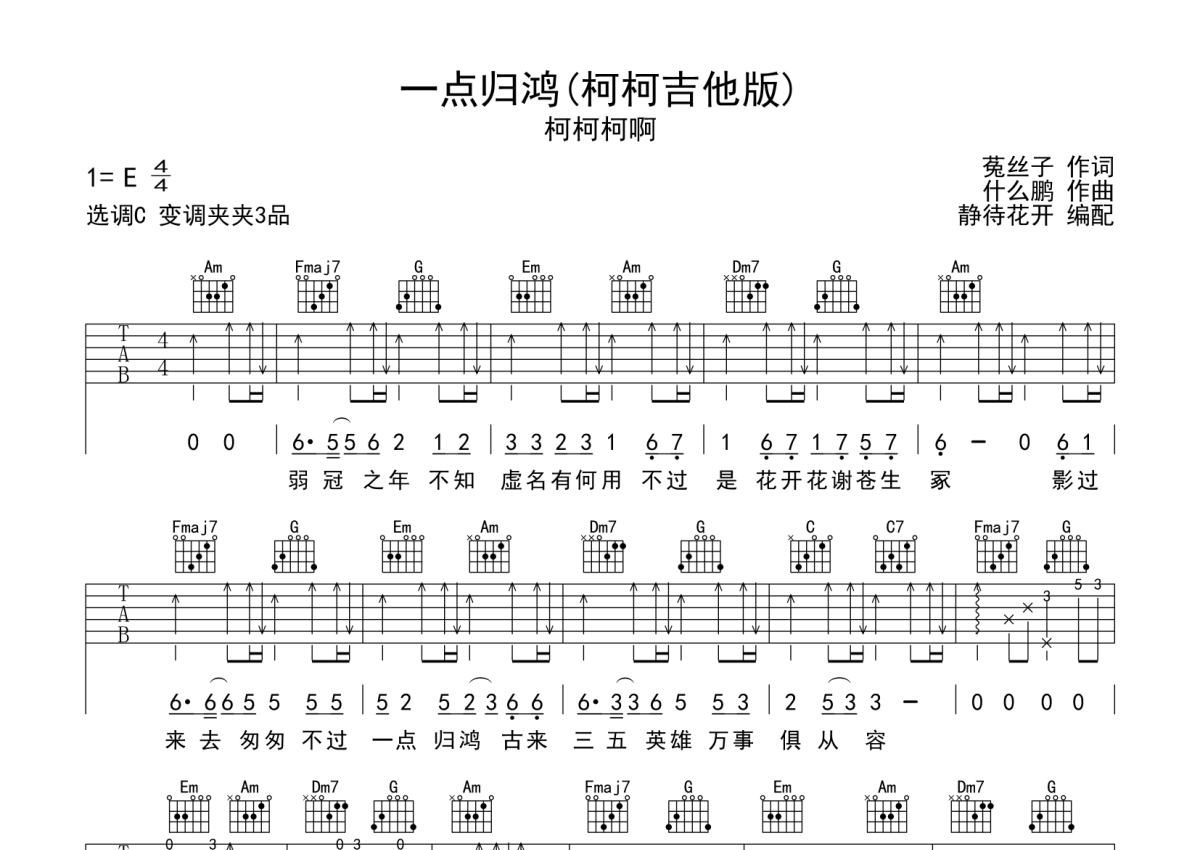 《一点归鸿》是柯柯柯啊演唱的一首歌曲,本吉他谱采用的是C调指法编配,这份吉他谱共有两张高清图谱,图谱由 @静待花开 编配上传,图谱使用六线谱编配,包含吉他和弦指法、简谱以及歌词部分,使用这份一点归鸿吉他谱,可以让你更加方便地掌握这首歌曲的弹唱技巧,快来尝试吧。一点归鸿吉他弹唱谱,来自@静待花开编配制谱,本吉他谱采用C调和弦编配,演奏建议变调夹夹第4品,原调E调,琴友们也可以根据自己嗓音条件选择变调夹,演奏速度大概85拍每分钟,难度简单。