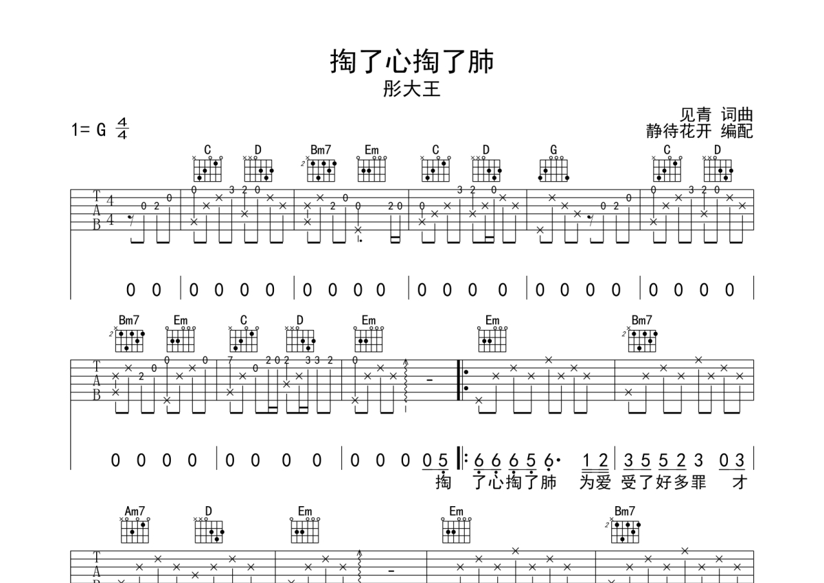 《掏了心掏了肺》是彤大王演唱的一首歌曲,本吉他谱采用的是G调指法编配,这份吉他谱共有两张高清图谱,图谱由 @静待花开 编配上传,图谱使用六线谱编配,包含吉他和弦指法、简谱以及歌词部分,使用这份掏了心掏了肺吉他谱,可以让你更加方便地掌握这首歌曲的弹唱技巧,快来尝试吧。掏了心掏了肺吉他六线谱,来自@静待花开编配制作,G调和弦指法演奏版,原调G调,推荐不夹变调夹,大家也可以根据实际情况选择变调夹,适合自己音高即可,速度大概每分钟86拍,整体难度简单。