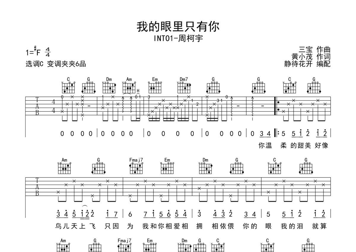 《我的眼里只有你》是INTO1-周柯宇演唱的一首歌曲,本吉他谱采用的是C调指法编配,这份吉他谱共有两张高清图谱,图谱由 @静待花开 编配上传,图谱使用六线谱编配,包含吉他和弦指法、简谱以及歌词部分,使用这份我的眼里只有你吉他谱,可以让你更加方便地掌握这首歌曲的弹唱技巧,快来尝试吧。我的眼里只有你吉他弹唱谱,来自@静待花开编配制谱,本吉他谱采用C调和弦编配,演奏建议变调夹夹第6品,原调#F转#G调,未做转调处理,琴友们也可以根据自己嗓音条件选择变调夹,演奏速度大概75拍每分钟,难度简单。