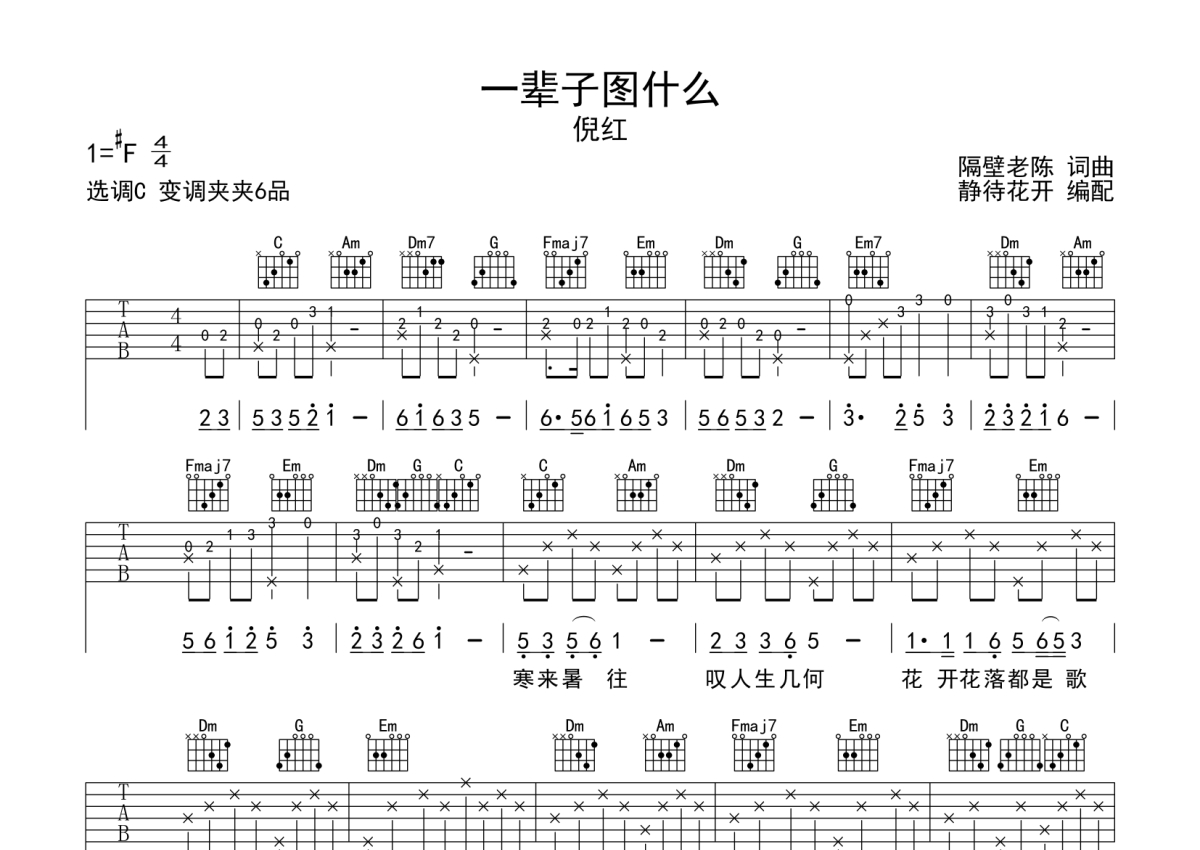 《一辈子图什么》是倪红演唱的一首歌曲,本吉他谱采用的是C调指法编配,这份吉他谱共有两张高清图谱,图谱由 @静待花开 编配上传,图谱使用六线谱编配,包含吉他和弦指法、简谱以及歌词部分,使用这份一辈子图什么吉他谱,可以让你更加方便地掌握这首歌曲的弹唱技巧,快来尝试吧。一辈子图什么吉他谱,来自@静待花开编配扒谱,采用C调和弦指法演奏,推荐变调夹夹第6品,原调为#F调,也可以根据个人嗓音灵活选择变调夹位置,演奏速度大约每分钟75拍,演奏难度为简单。