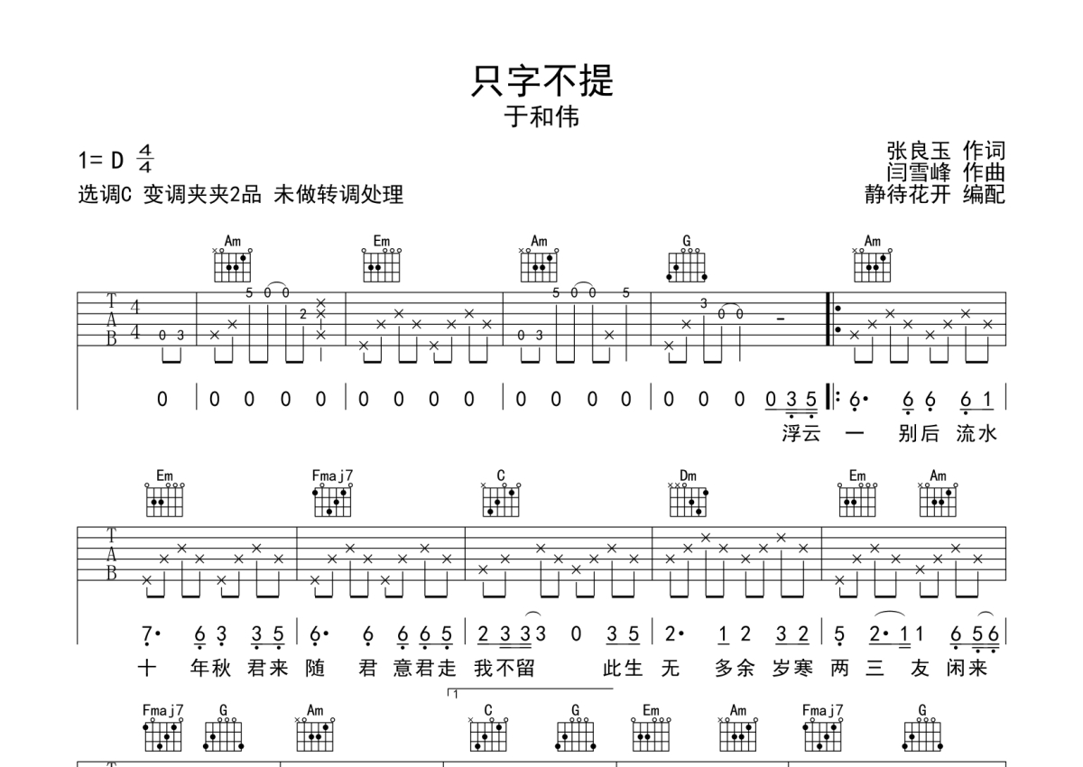 《只字不提》是于和伟演唱的一首歌曲,本吉他谱采用的是C调指法编配,这份吉他谱共有三张高清图谱,图谱由 @静待花开 编配上传,图谱使用六线谱编配,包含吉他和弦指法、简谱以及歌词部分,使用这份只字不提吉他谱,可以让你更加方便地掌握这首歌曲的弹唱技巧,快来尝试吧。只字不提吉他六线谱,来自@静待花开编配制作, C调和弦指法演奏版,未做转调处理,原调D转E调,推荐变调夹夹2品,大家也可以根据实际情况选择变调夹,适合自己音高即可,速度大概每分钟80拍,整体难度简单。