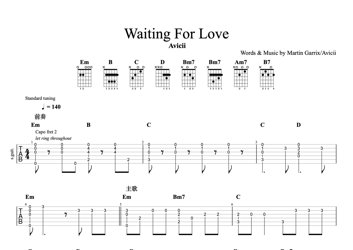 Avicii《Waiting For Love》吉他谱 - G调独奏六线谱 - 完整编配版