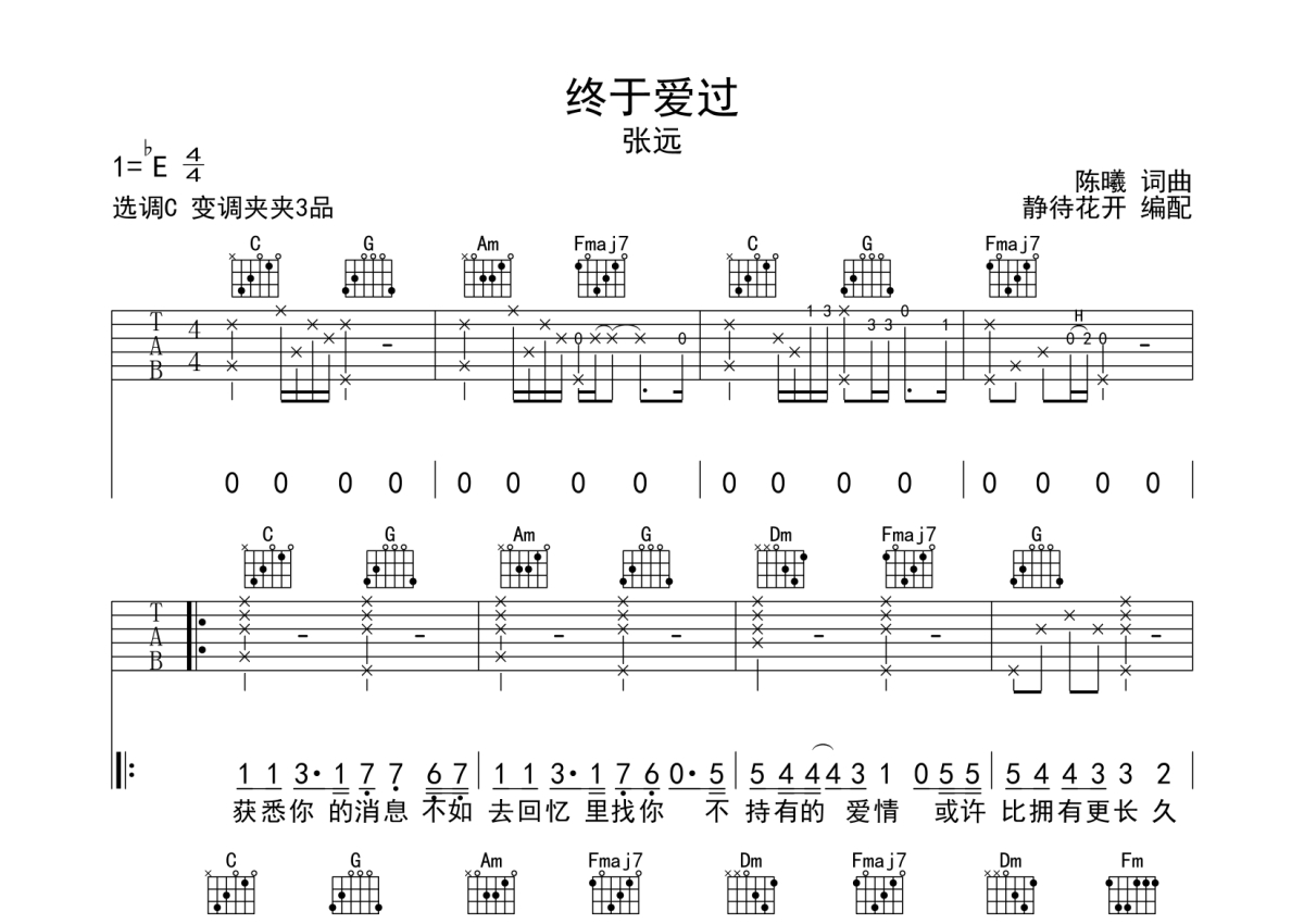 张远《终于爱过》吉他谱 - C调弹唱六线谱
