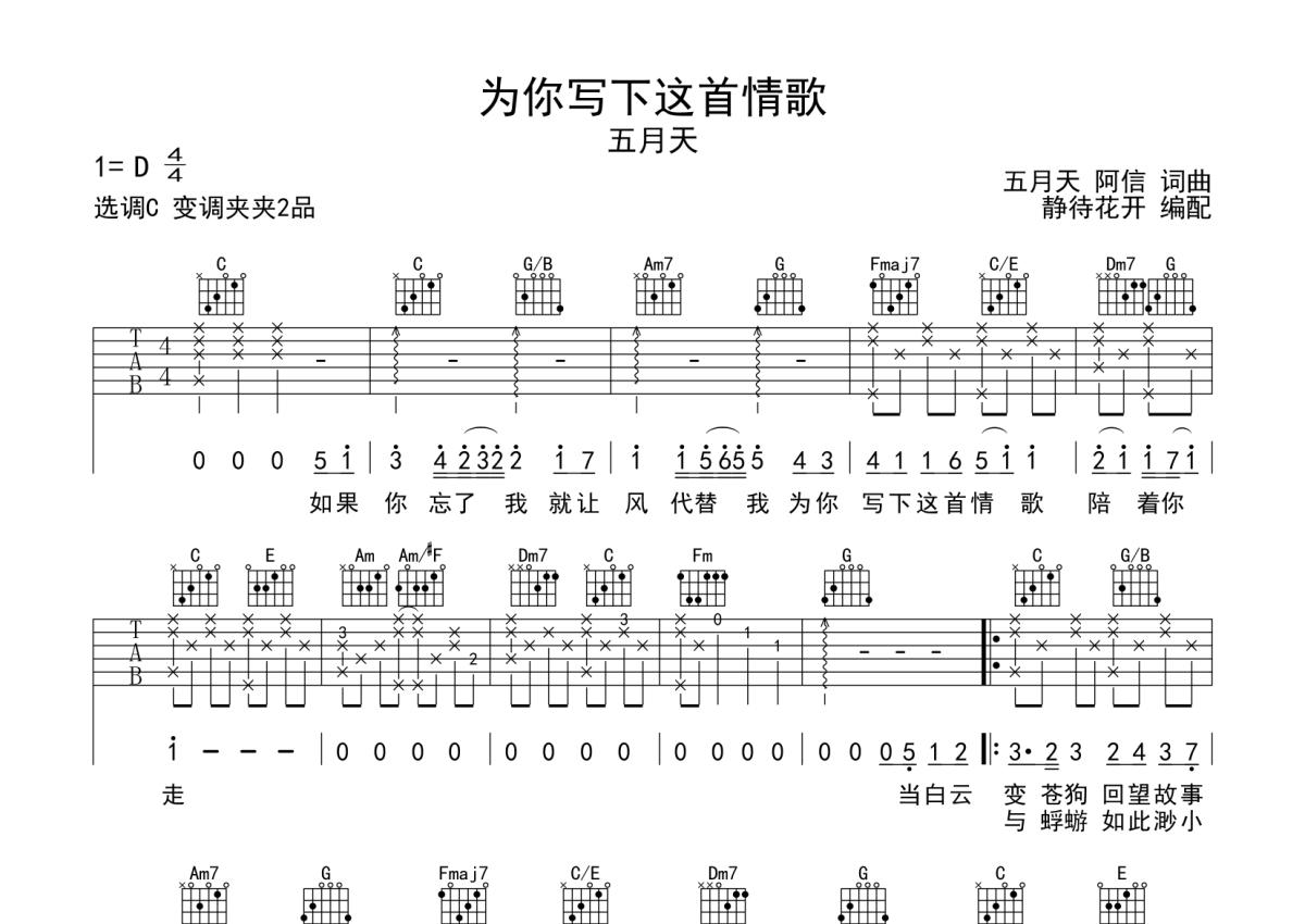 五月天《为你写下这首情歌》吉他谱 - C调弹唱六线谱
