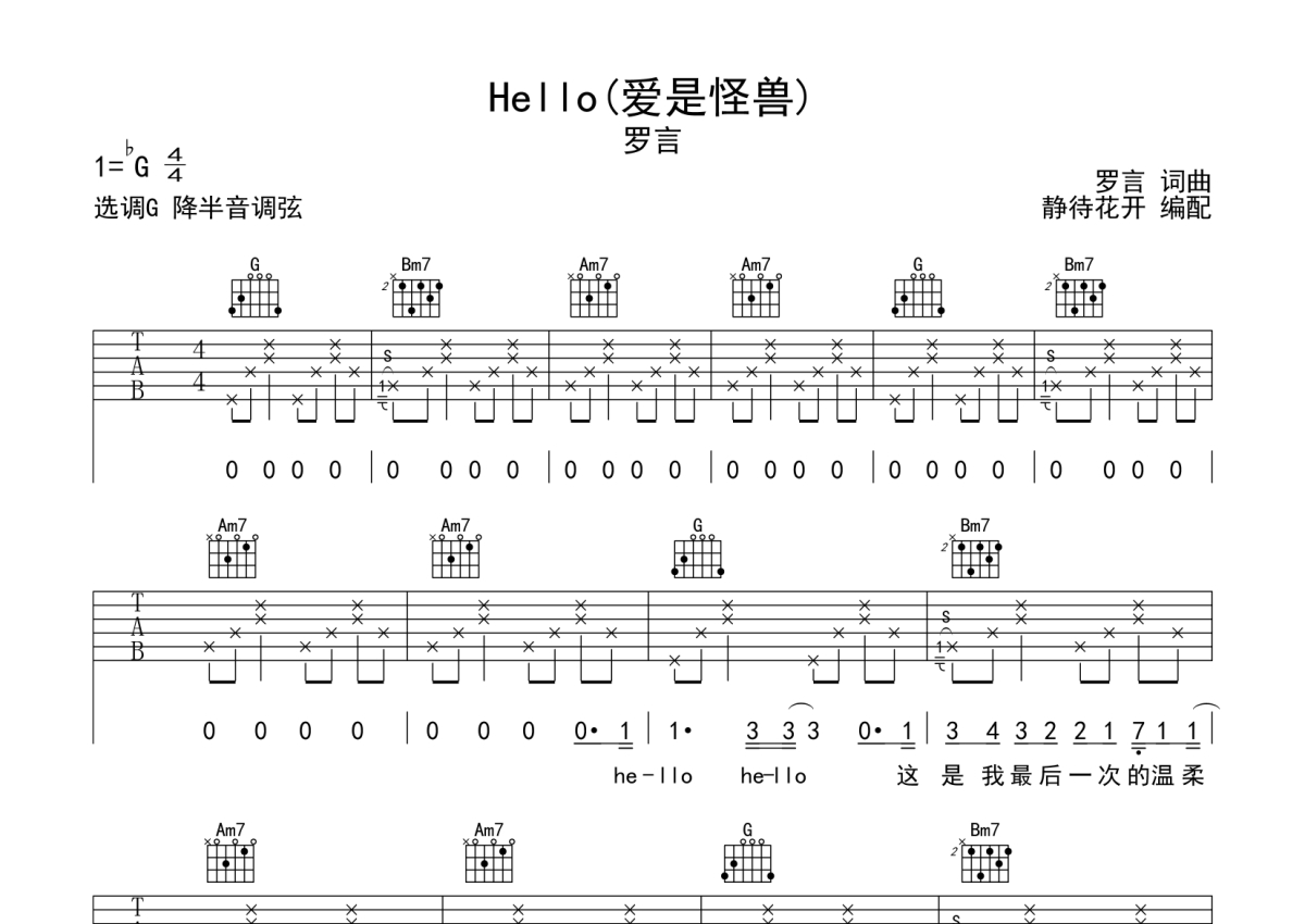 罗言《Hello(爱是怪兽)》吉他谱 - G调弹唱六线谱