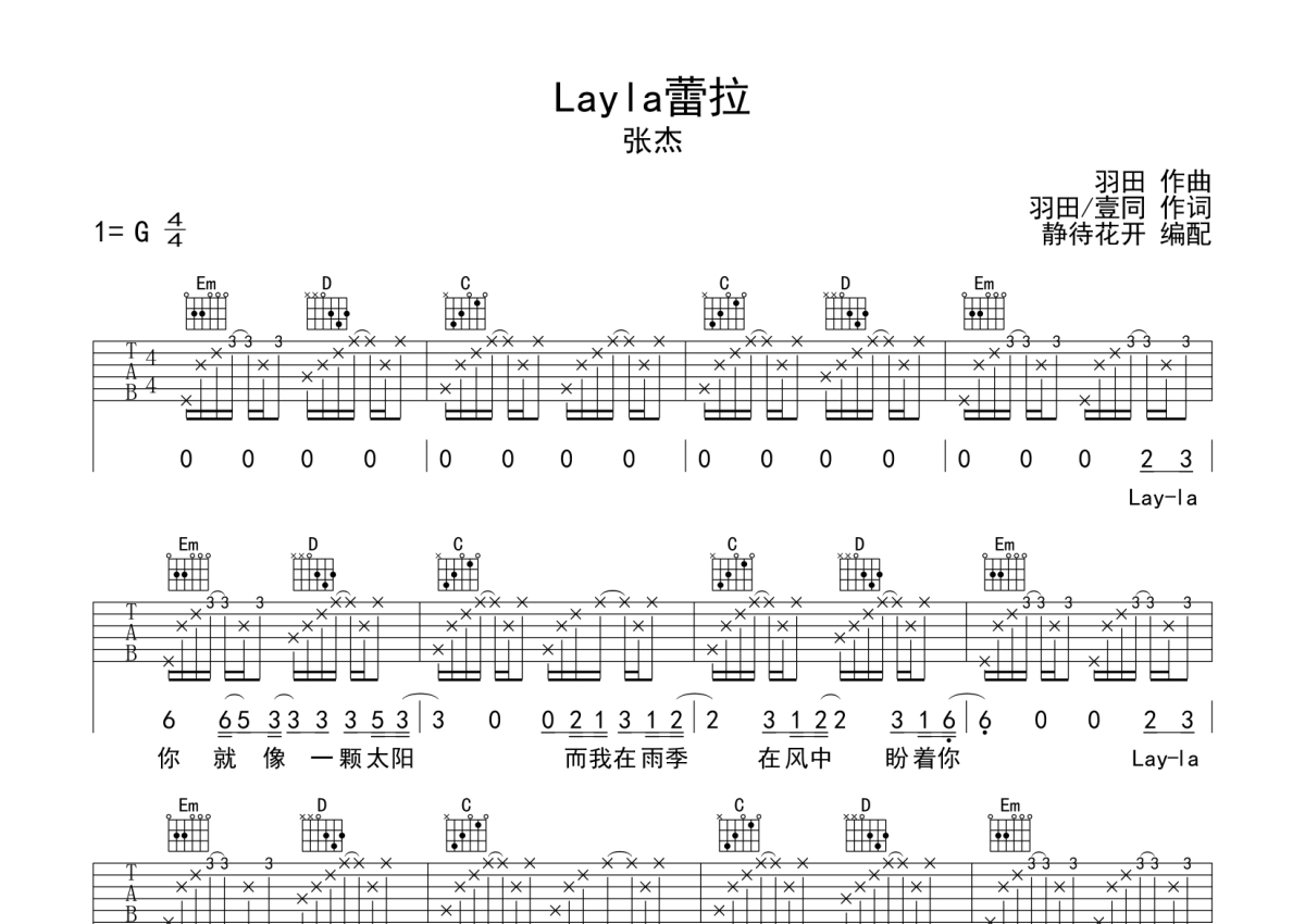 张杰《Layla蕾拉》吉他谱 - G调弹唱六线谱