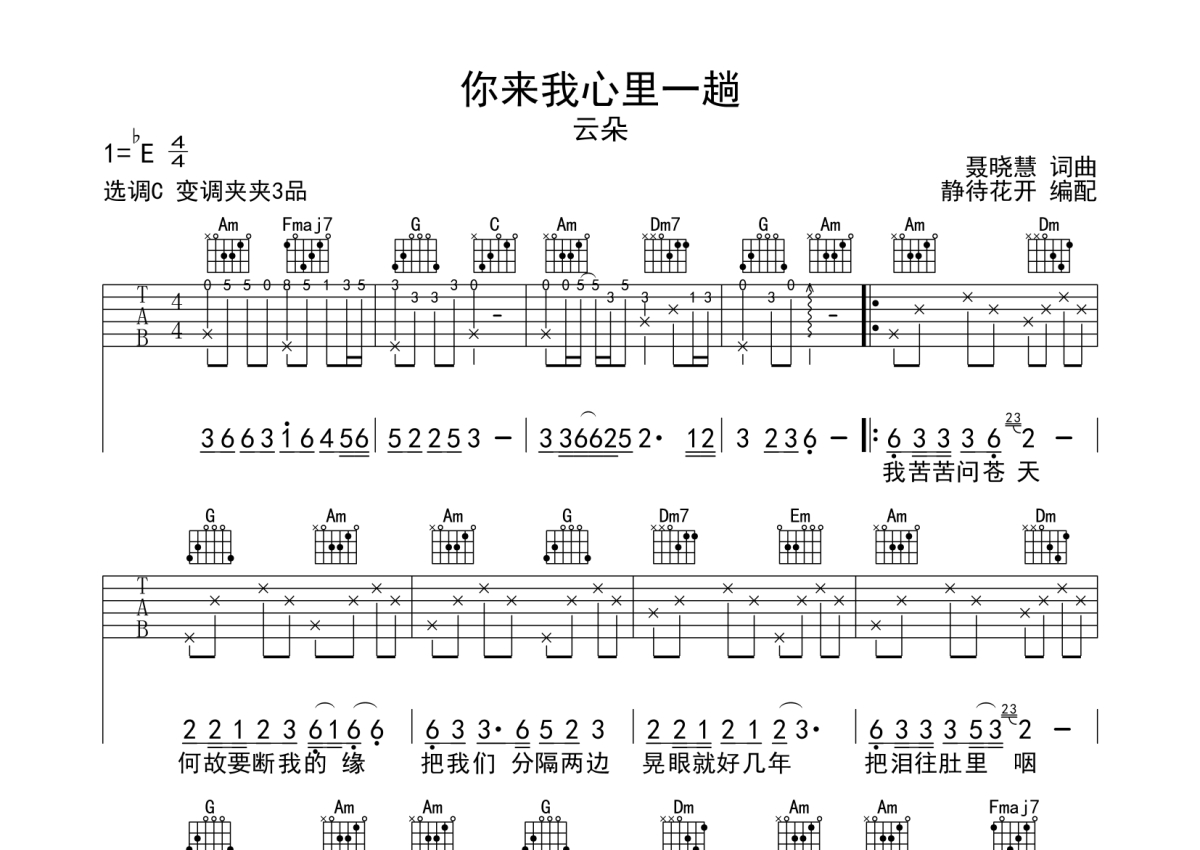 一云朵《你来我心里一趟》吉他谱 - C调弹唱六线谱
