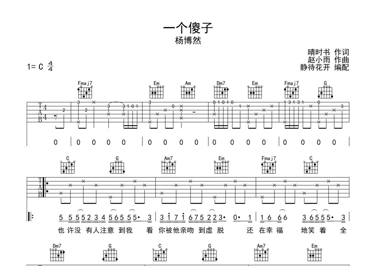 杨博然《一个傻子》吉他谱 - C调弹唱六线谱