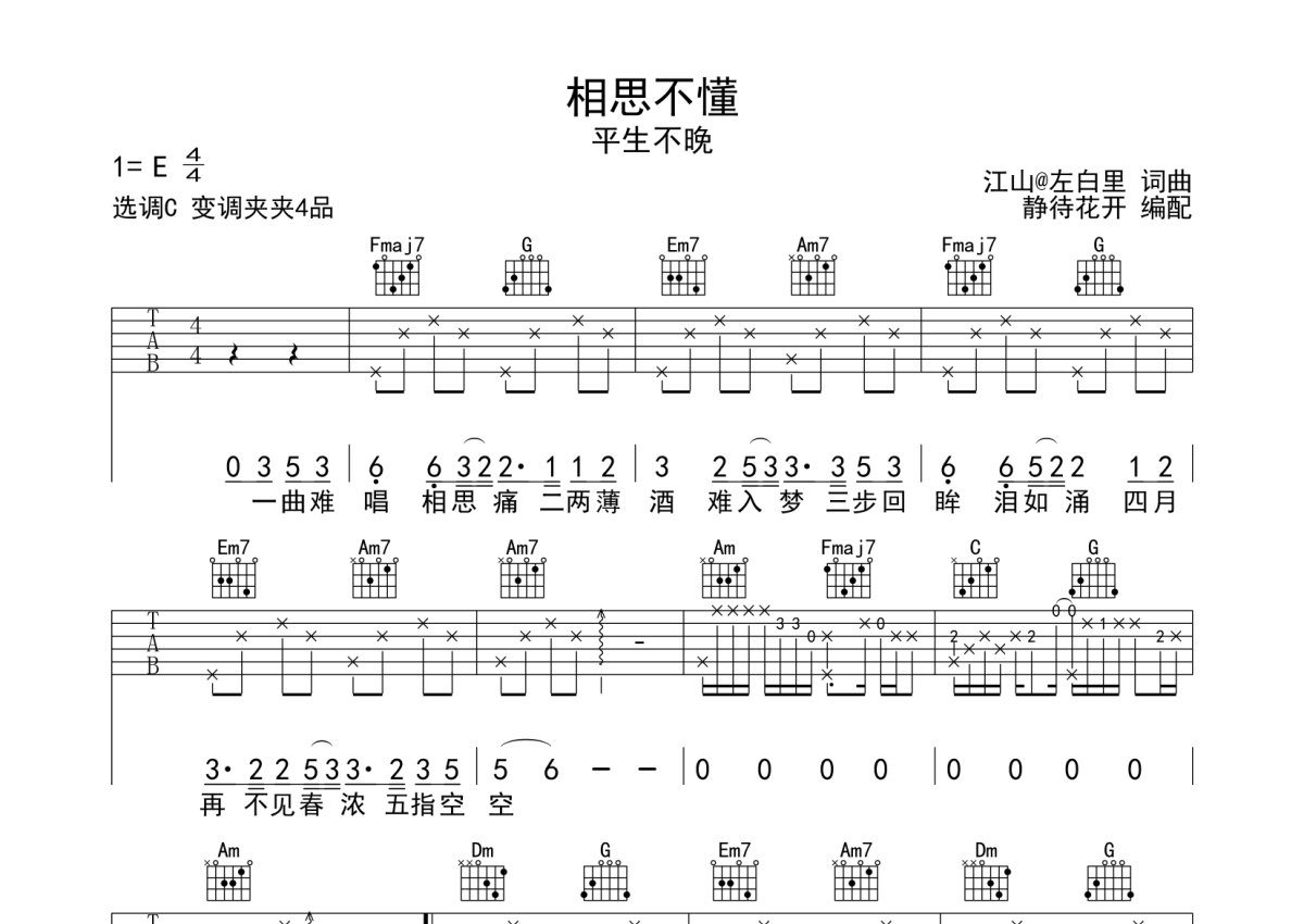 《相思不懂》是平生不晚演唱的一首歌曲,本吉他谱采用的是C调指法编配,这份吉他谱共有两张高清图谱,图谱由 @静待花开 编配上传,图谱使用六线谱编配,包含吉他和弦指法、简谱以及歌词部分,使用这份相思不懂吉他谱,可以让你更加方便地掌握这首歌曲的弹唱技巧,快来尝试吧。来自@静待花开编配吉他谱,采用C调和弦指法演奏,推荐变调夹夹第4品,原调E调,也可以根据个人嗓音灵活选择变调夹位置,演奏速度大约每分钟85拍,演奏难度简单。