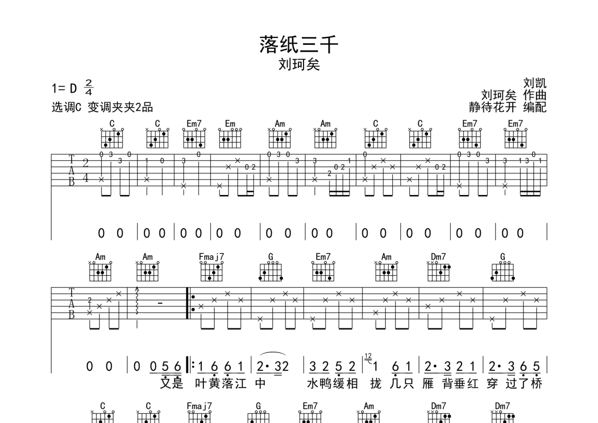 《落纸三千》是刘珂矣演唱的一首歌曲,本吉他谱采用的是C调指法编配,这份吉他谱共有两张高清图谱,图谱由 @静待花开 编配上传,图谱使用六线谱编配,包含吉他和弦指法、简谱以及歌词部分,使用这份落纸三千吉他谱,可以让你更加方便地掌握这首歌曲的弹唱技巧,快来尝试吧。来自@静待花开编配制谱,本吉他谱采用C调和弦编配,演奏建议变调夹夹第2品,原调D调,琴友们也可以根据自己嗓音条件选择变调夹,演奏速度大概80拍每分钟,难度简单。