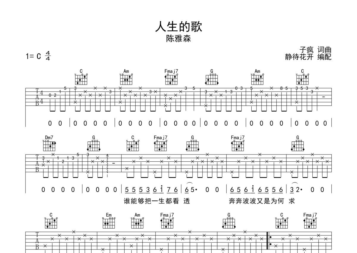 陈雅森《人生的歌》吉他谱 - C调弹唱六线谱