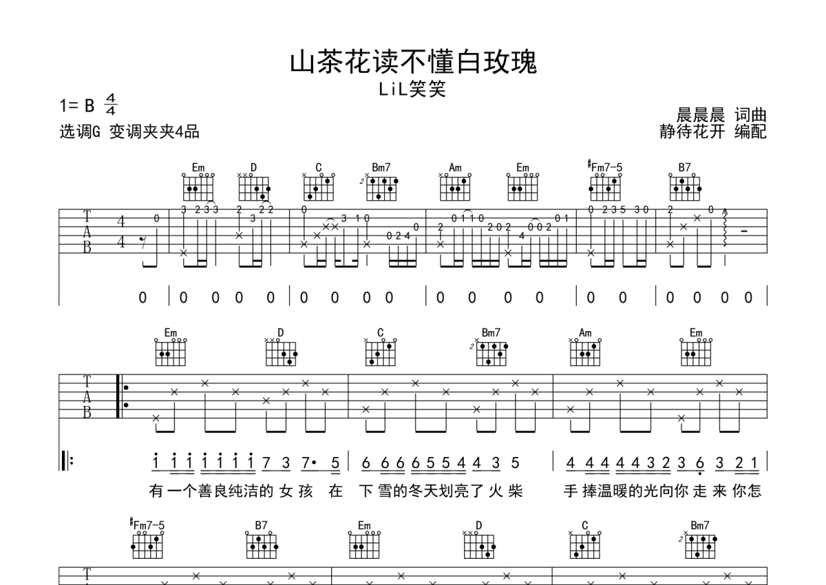 Lil笑笑《山茶花读不懂白玫瑰》吉他谱 - G调弹唱六线谱