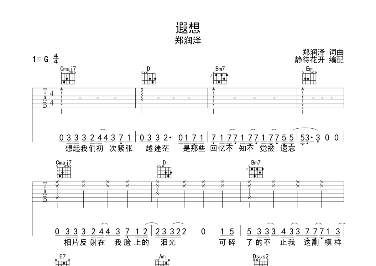 郑润泽《遐想》吉他谱 - G调弹唱六线谱