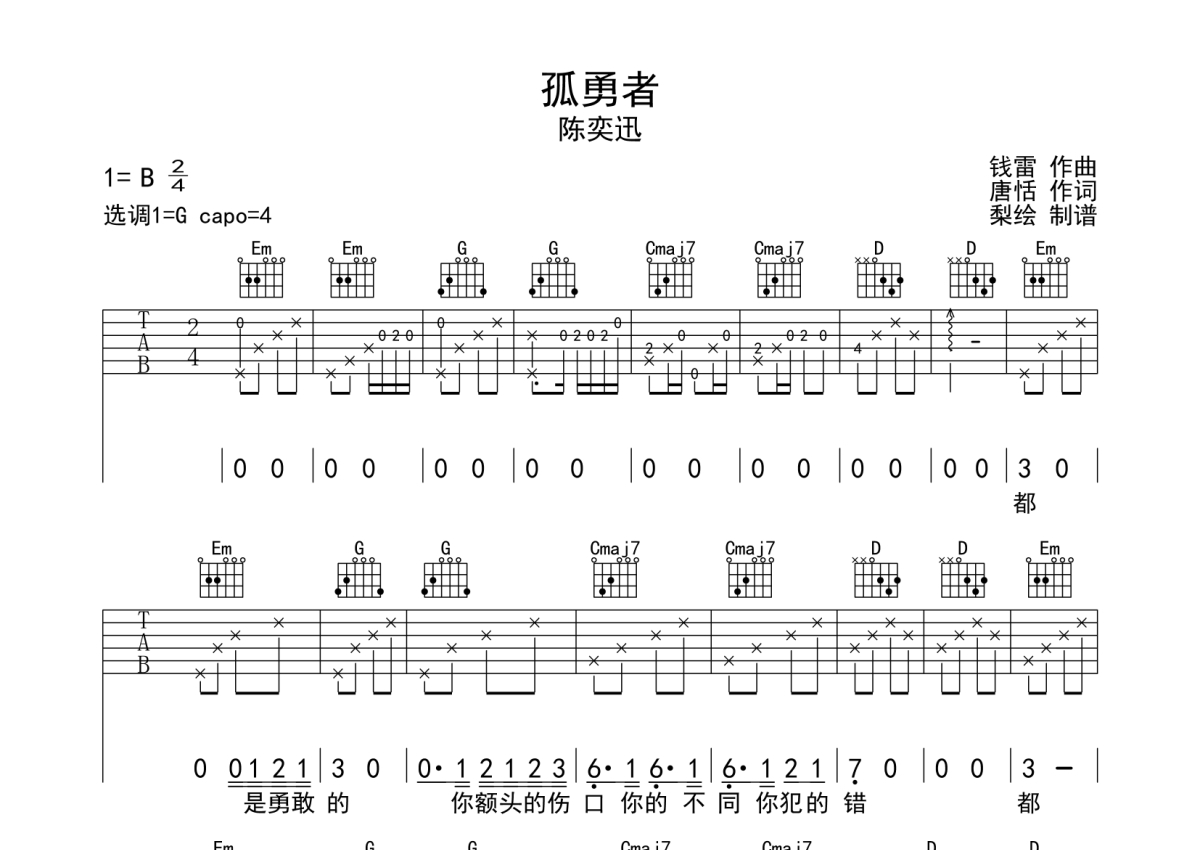 陈奕迅《孤勇者》吉他谱 - G调弹唱六线谱