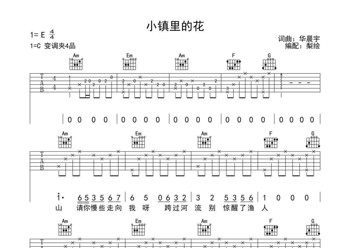 华晨宇《小镇里的花》吉他谱 - C调弹唱六线谱