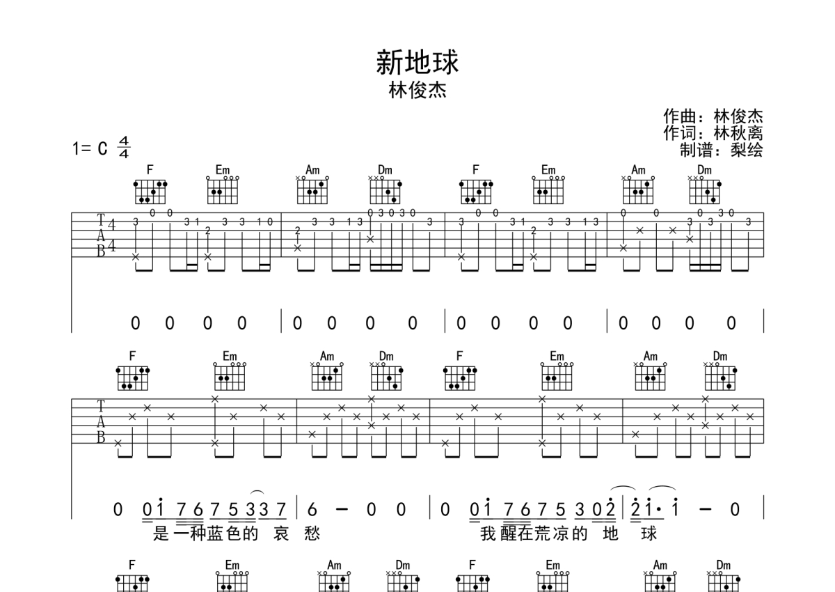 林俊杰《新地球》吉他谱 - C调弹唱六线谱