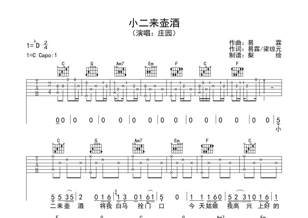 庄园《小二来壶酒》吉他谱 - C调弹唱六线谱