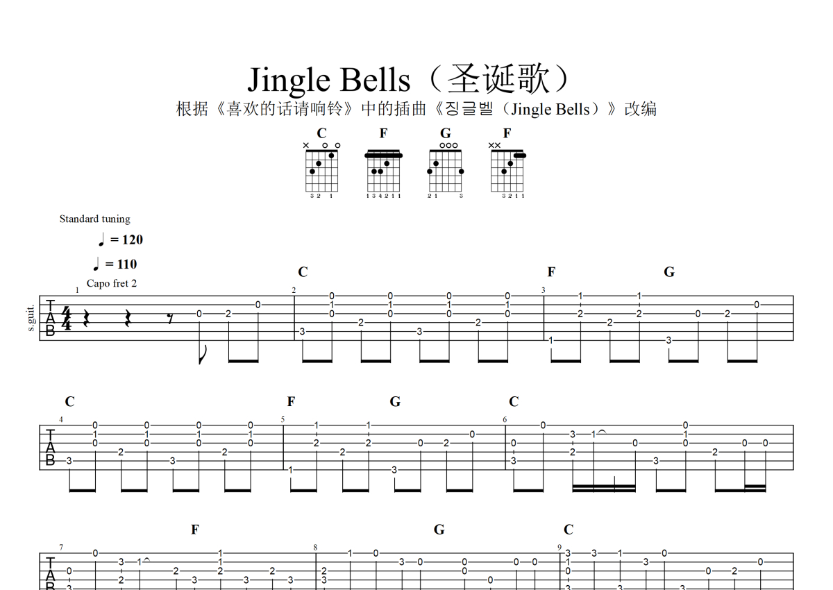 《Jingle Bells》是圣诞歌演唱的一首歌曲,本吉他谱采用的是C调指法编配,这份吉他谱共有两张高清图谱,图谱由 @呜呼 编配上传,图谱使用六线谱编配,曲谱配备了相关的音频提供试听,使用这份Jingle Bells吉他谱,可以让你更加方便地掌握这首歌曲的演奏技巧,快来尝试吧。根据《喜欢的话请响铃》中的插曲《징글벨(JingleBells)》改编。
