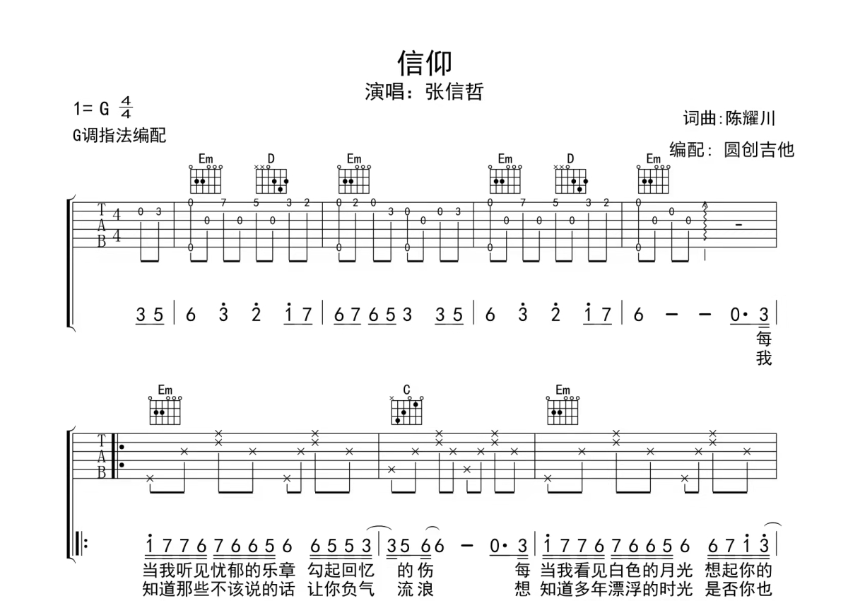张信哲《信仰》吉他谱 - G调弹唱六线谱 - 分解加扫弦编配
