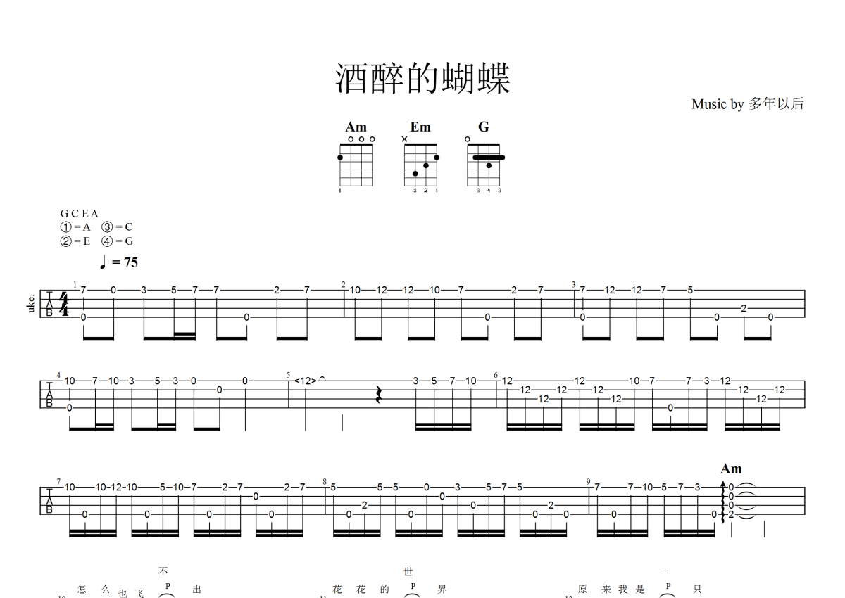 《酒醉的蝴蝶》是崔立伟演唱的一首歌曲,本尤克里里谱采用的是C调指法编配,这份尤克里里谱共有两张高清图谱,图谱由 @大狼指弹 编配上传,图谱使用四线谱编配,包含尤克里里和弦指法、简谱以及歌词部分,曲谱配备了相关的音频提供试听,使用这份酒醉的蝴蝶尤克里里谱,可以让你更加方便地掌握这首歌曲的弹唱技巧,快来尝试吧。《酒醉的蝴蝶》尤克里里指弹独奏谱。