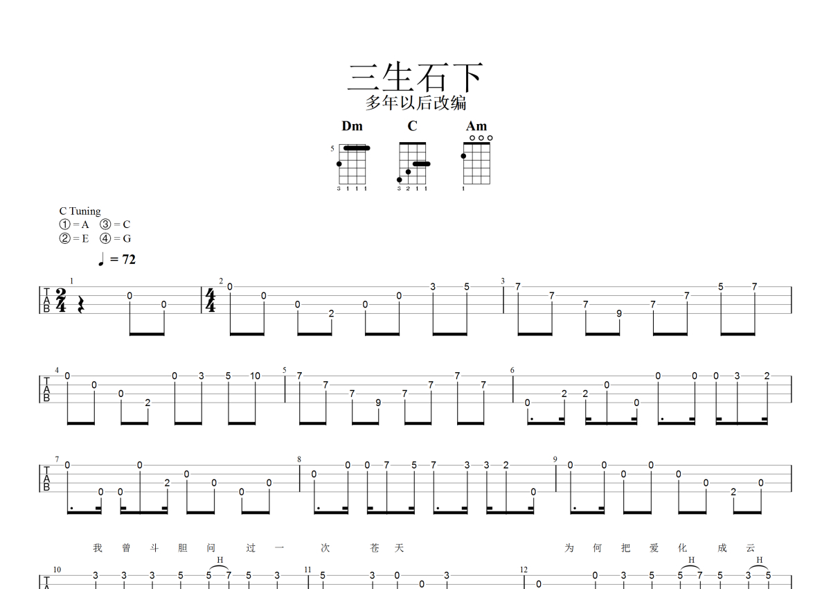 大欢《三生石下》尤克里里谱 - C调尤克里里谱