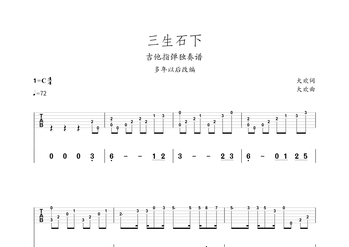大欢《三生石下》吉他谱 - C调独奏六线谱