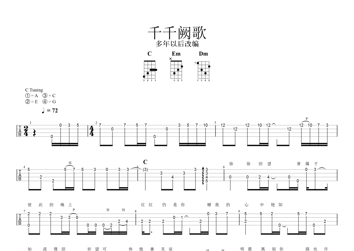 《千千阙歌》是陈慧娴演唱的一首歌曲,指弹,本尤克里里谱采用的是C调指法编配,这份尤克里里谱共有两张高清图谱,图谱由 @大狼指弹 编配上传,图谱使用四线谱编配,包含尤克里里和弦指法、简谱以及歌词部分,曲谱配备了相关的音频提供试听,使用这份千千阙歌尤克里里谱,可以让你更加方便地掌握这首歌曲的弹唱技巧,快来尝试吧。《千千阙歌》尤克里里指弹独奏曲谱,C调指法,好听不难!。