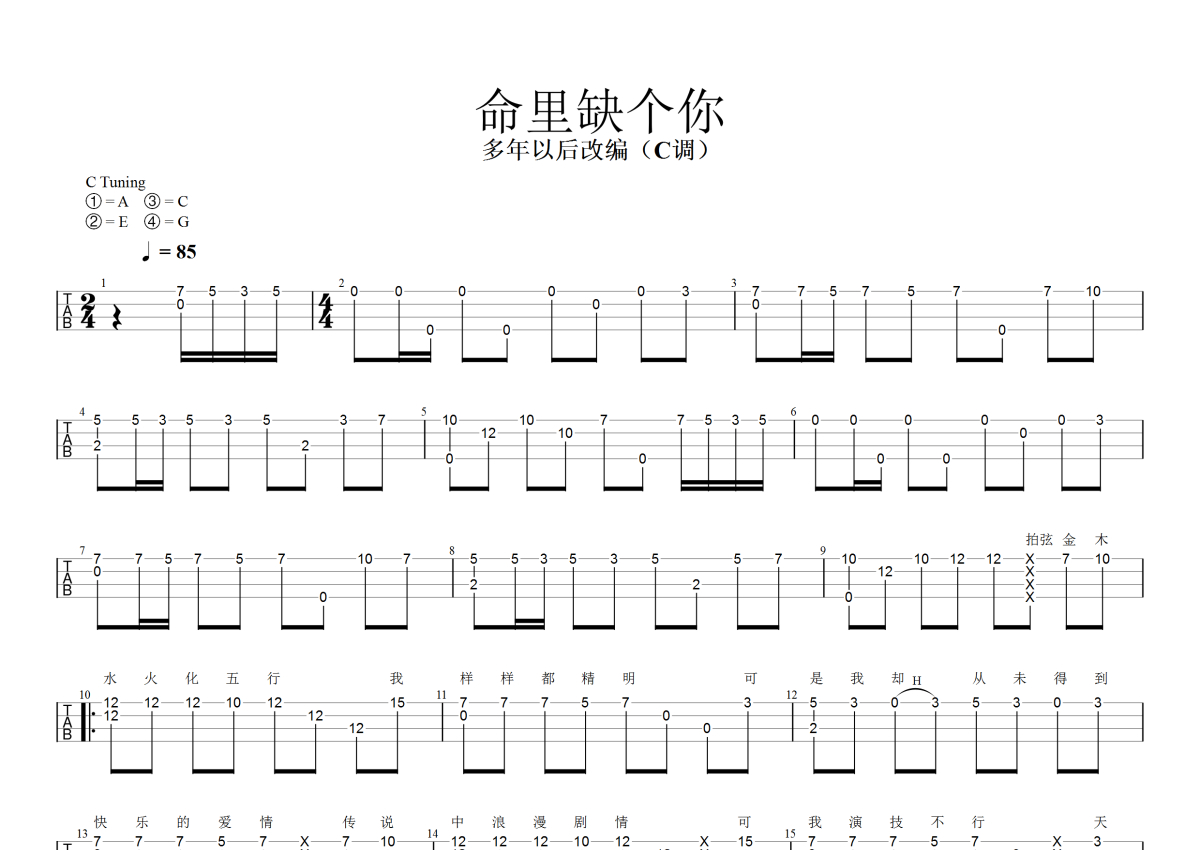 《命里缺个你》是马博演唱的一首歌曲,指弹,本尤克里里谱采用的是C调指法编配,这份尤克里里谱共有两张高清图谱,图谱由 @大狼指弹 编配上传,图谱使用四线谱编配,包含尤克里里和弦指法、简谱以及歌词部分,曲谱配备了相关的音频提供试听,使用这份命里缺个你尤克里里谱,可以让你更加方便地掌握这首歌曲的弹唱技巧,快来尝试吧。《命里缺个你》尤克里里指弹独奏曲谱。