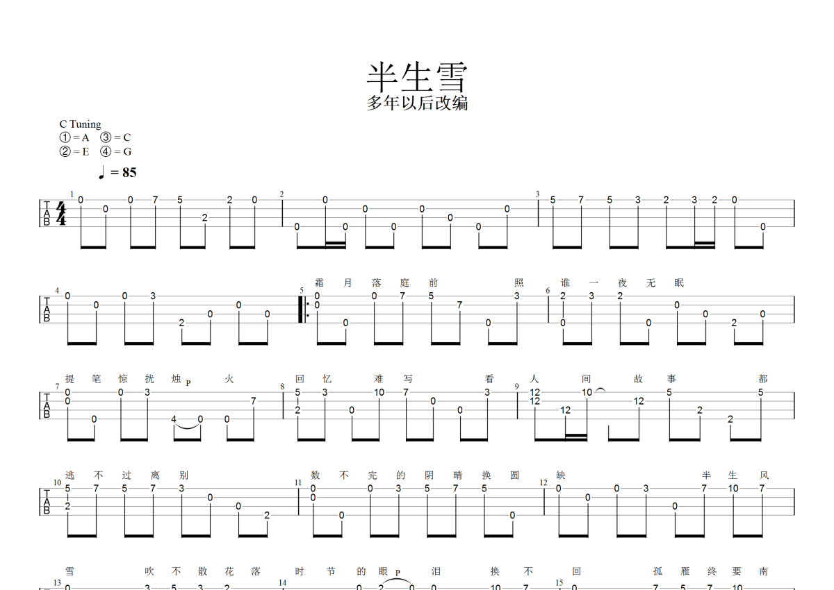 《半生雪》是七叔演唱的一首歌曲,指弹,本尤克里里谱采用的是C调指法编配,这份尤克里里谱共有两张高清图谱,图谱由 @大狼指弹 编配上传,图谱使用四线谱编配,包含尤克里里和弦指法、简谱以及歌词部分,曲谱配备了相关的音频提供试听,使用这份半生雪尤克里里谱,可以让你更加方便地掌握这首歌曲的弹唱技巧,快来尝试吧。七叔《半生雪》_C调尤克里里谱_指弹。